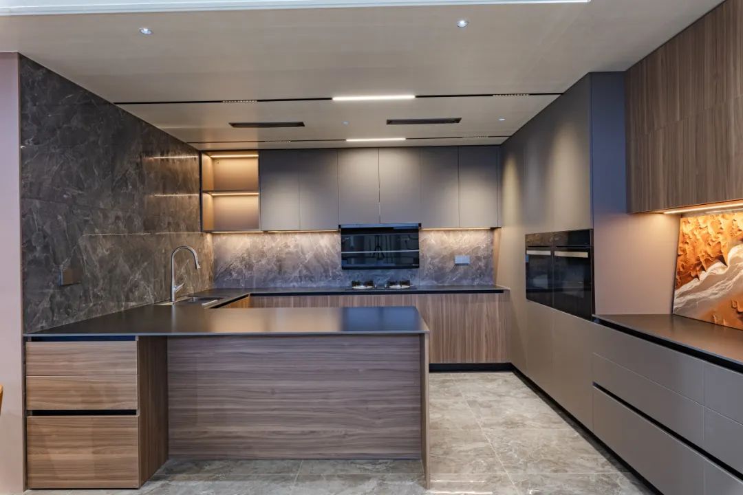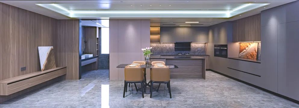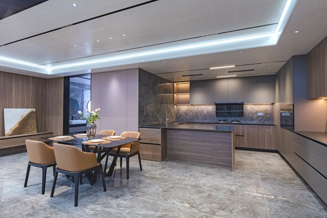 整間廚房選用深胡桃木紋色搭配太空灰,在暖色光源的烘托下,顯得溫馨且不失高級質(zhì)感。