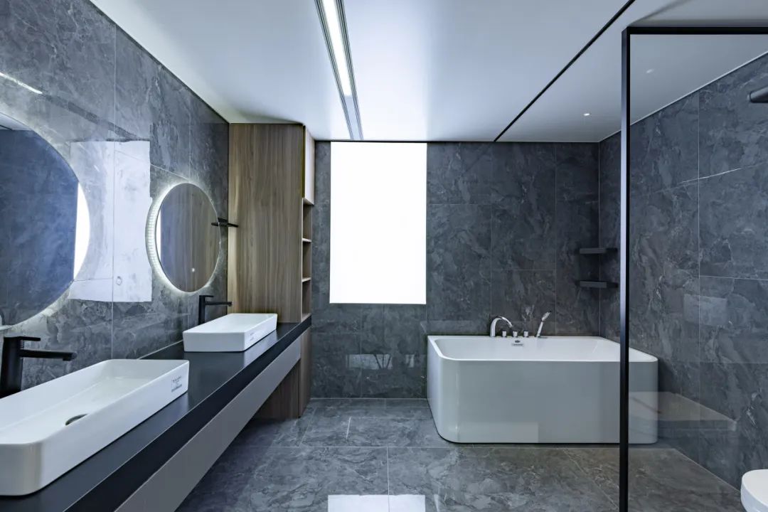 衛(wèi)生間墻面選用高光生態(tài)木實芯墻板,頂面搭配無膠大板和線型取暖,采用干濕分區(qū)和無主燈設(shè)計,簡約時尚。