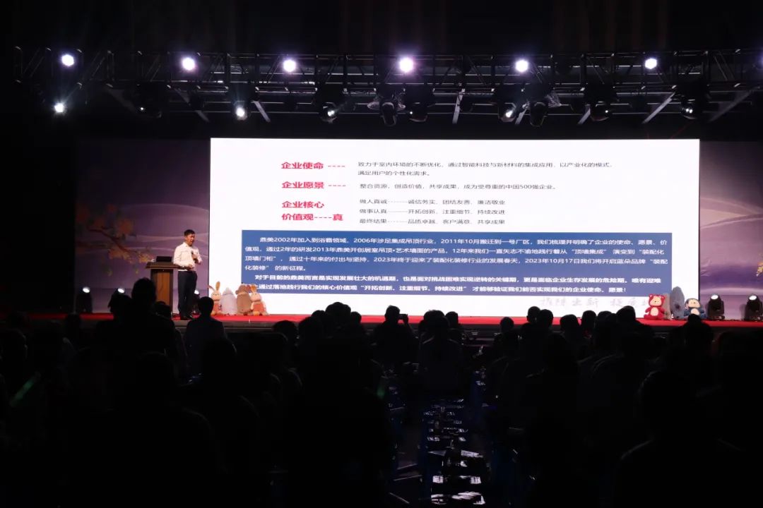 開場后,伴隨著熱烈的掌聲,董事長張軻先生上臺致辭。張董再次強(qiáng)調(diào)了要牢記鼎美使命、愿景、核心價值觀,保持自信自律自強(qiáng),做人真誠、做事認(rèn)真。隨著國家層面在推動智能建造、浙江省極力推進(jìn)裝配式裝修,嘉興市、秀洲區(qū)在全力推進(jìn)裝配化頂墻門柜產(chǎn)業(yè)的提檔升級,我們要搶抓裝配化產(chǎn)業(yè)的發(fā)展機(jī)遇實現(xiàn)行業(yè)與企業(yè)的高質(zhì)量發(fā)展。未來已來,蓄勢待發(fā)。2023全力以赴,圍繞家裝業(yè)務(wù)打響品牌,以落地商裝加持企業(yè)規(guī)模,通過豹變實現(xiàn)爆發(fā)式增長。最后,張董送上節(jié)日的祝福,期待鼎美乘風(fēng)破浪向闊海、行穩(wěn)致遠(yuǎn)更輝煌!祝愿鼎美全體員工及合作伙伴中秋國慶雙節(jié)快樂,越來越好!