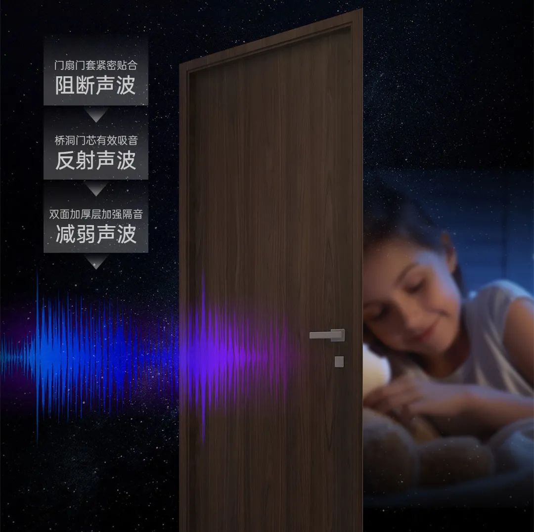 多重材質(zhì)與工藝通過減弱聲波、反射聲波、阻斷聲波三大方式隔音降噪,不論是門外嘈雜的噪音,還是門內(nèi)聚會看球賽的喝彩聲,都互不影響,動靜相宜。